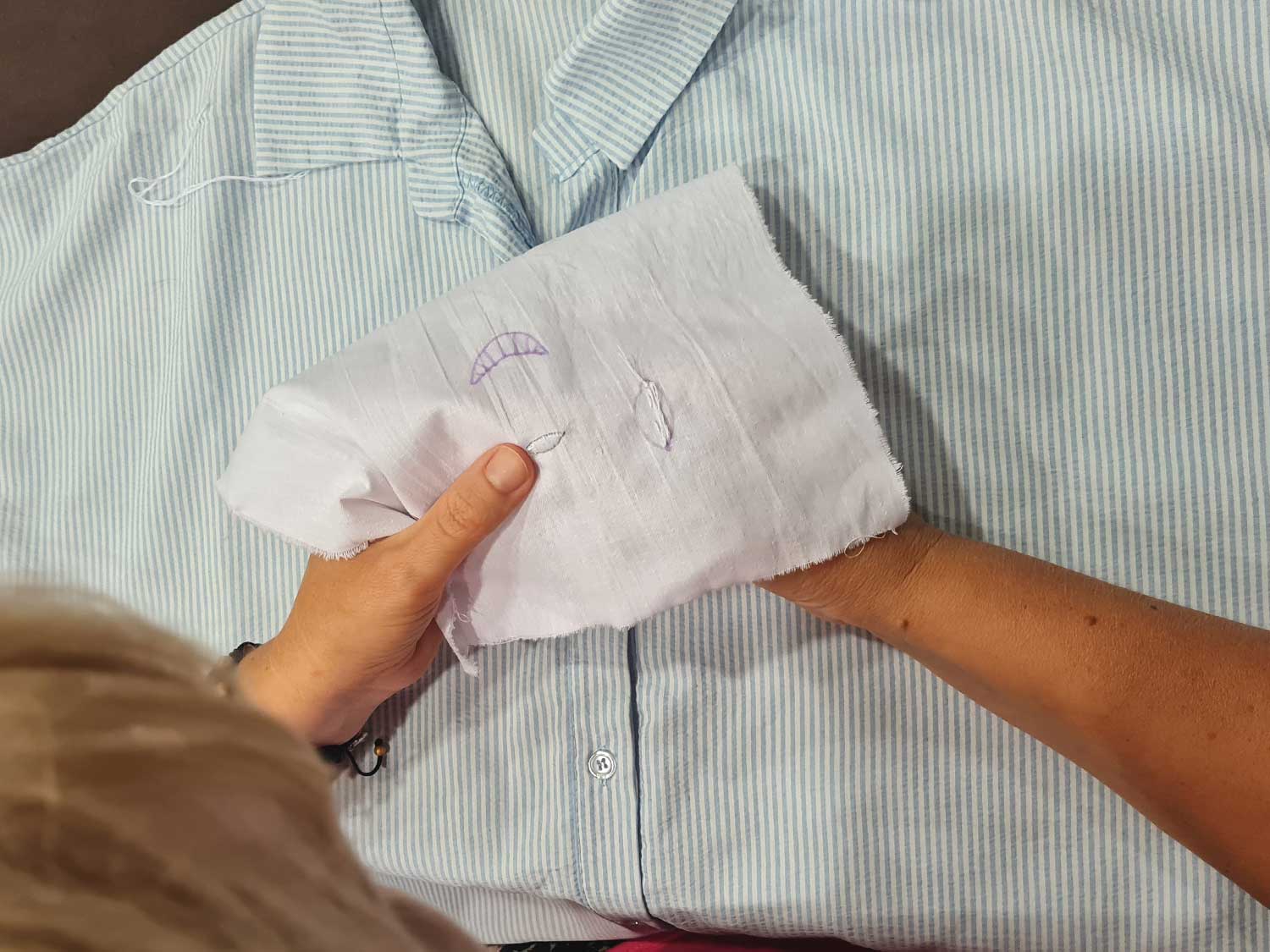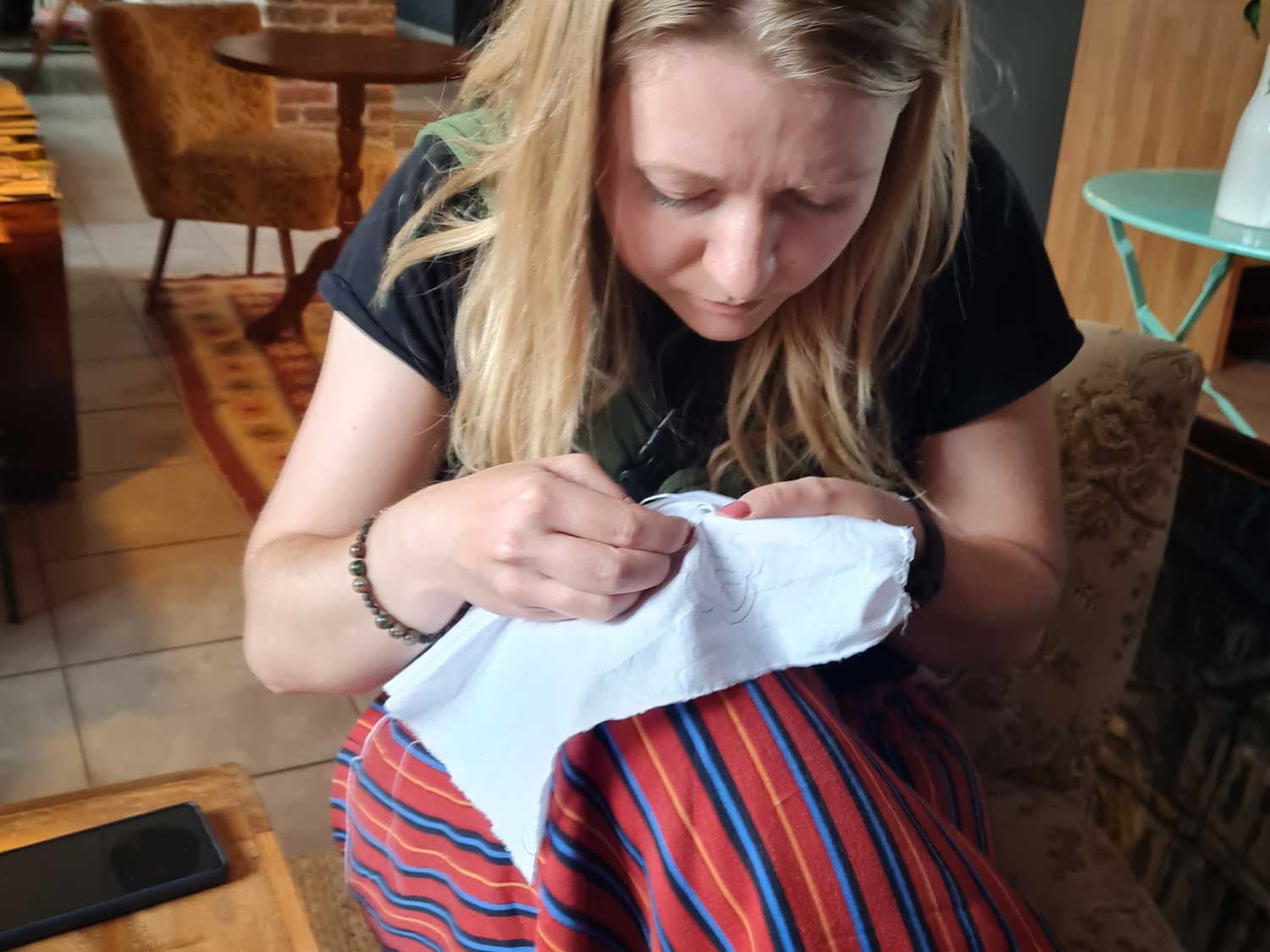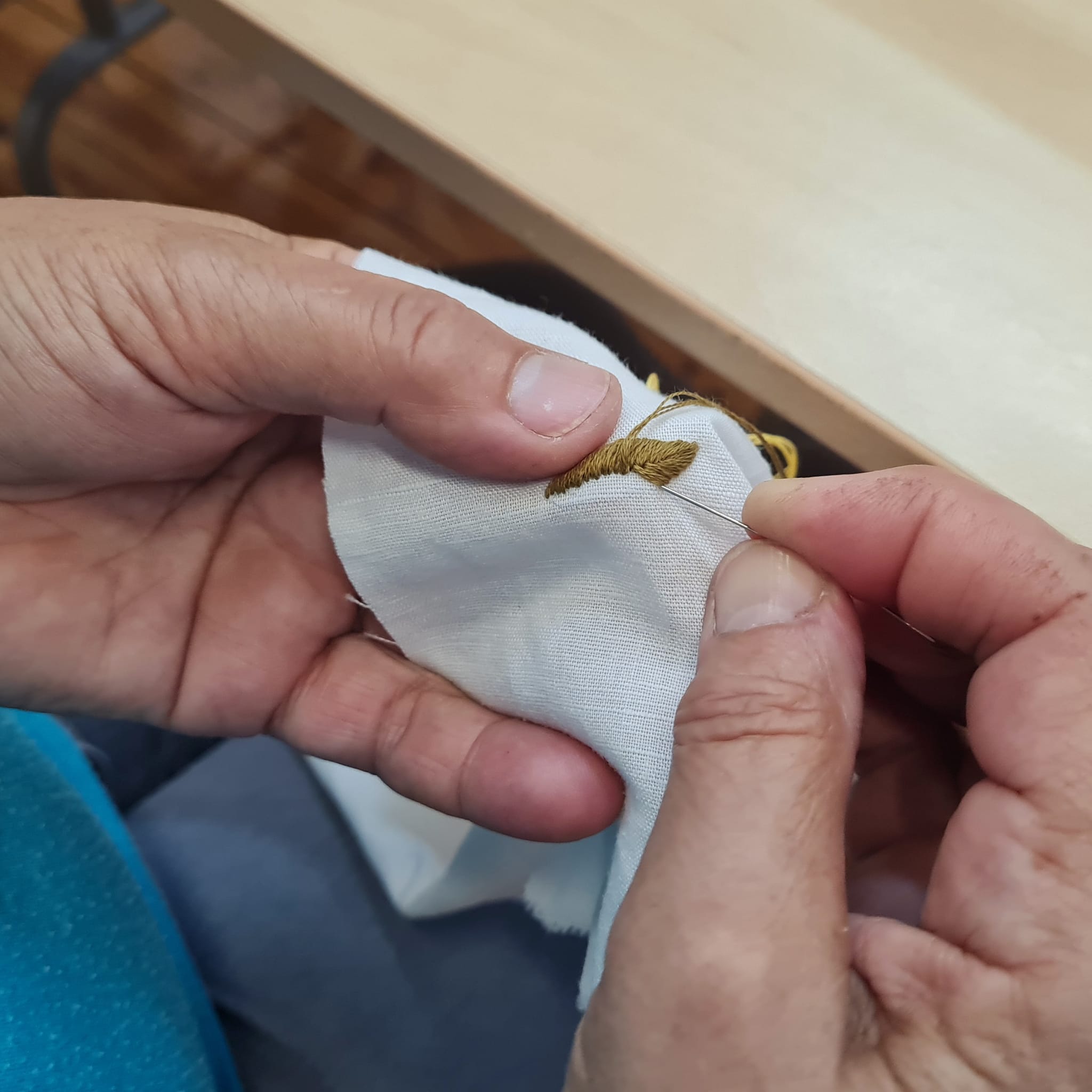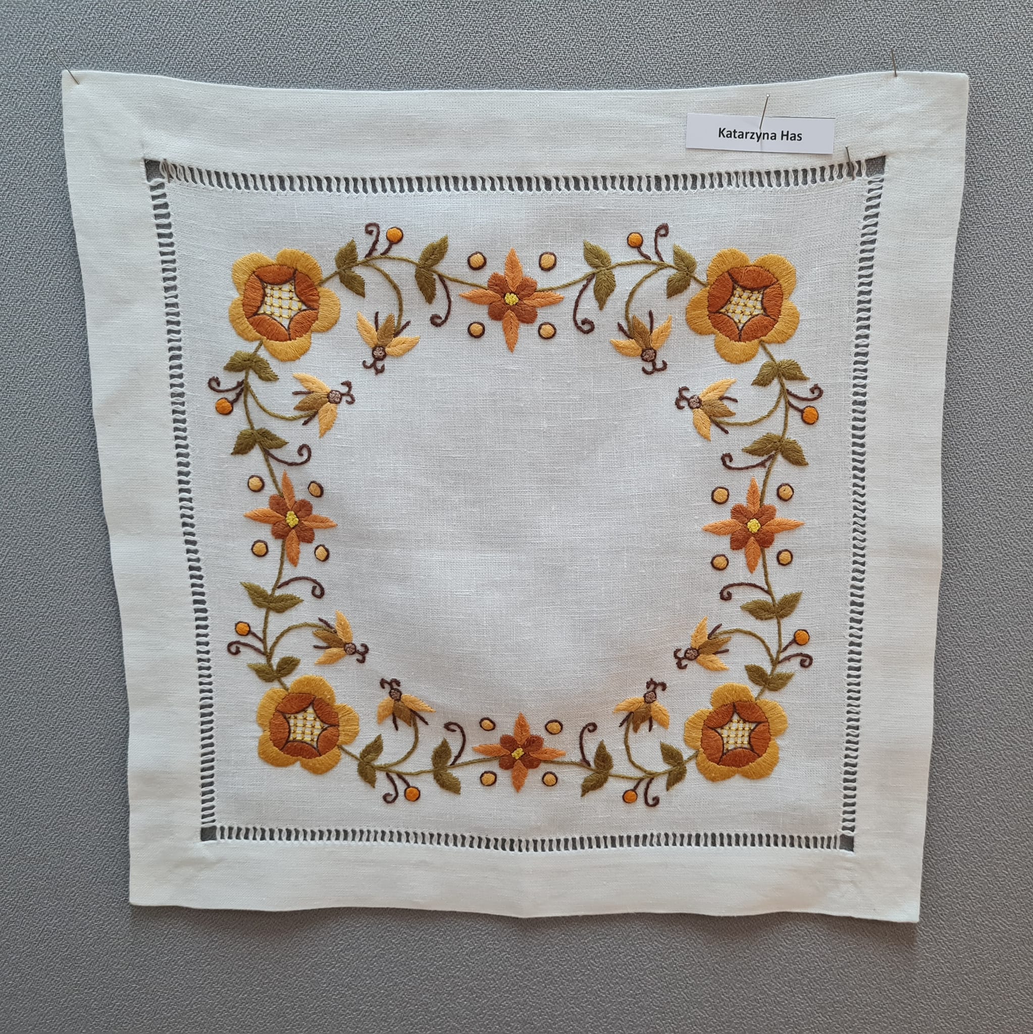 Dzięki uprzejmości Pani Maryli miałam okazje na żywo, z bliska zobaczyć konkursowe prace, jak i hafty wykonane na odzieży. Otrzymałam również przygotowaną próbkę, którą pod okiem Pani Maryli zaczęłam wyszywać. Mam nadzieje, że to nie było nasze ostatnie spotkanie.