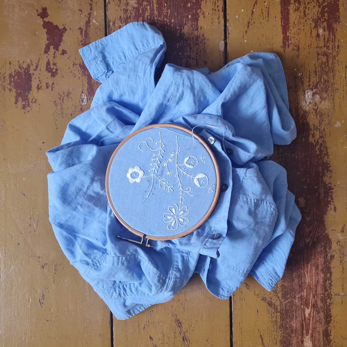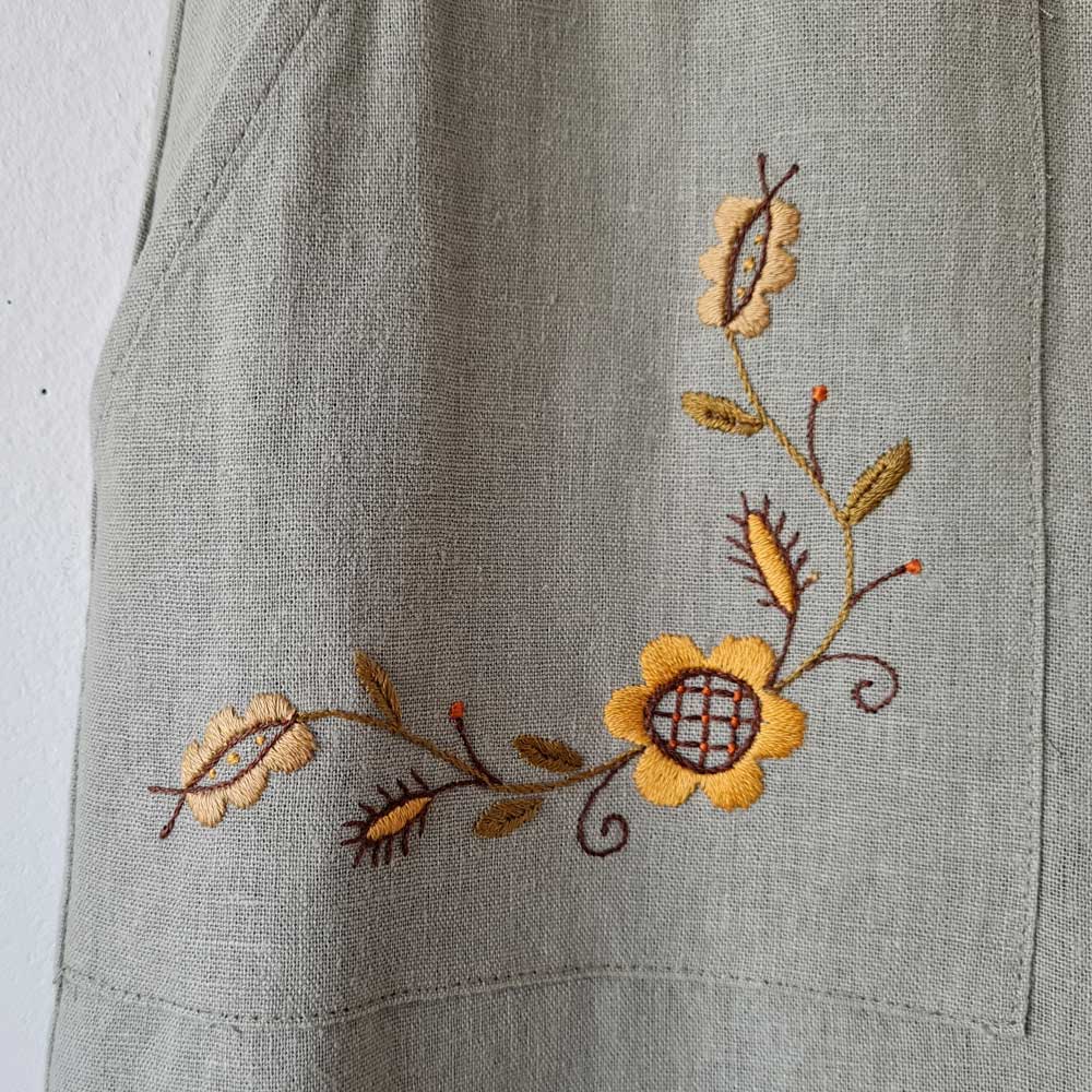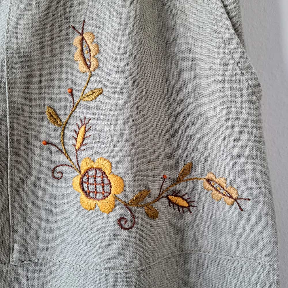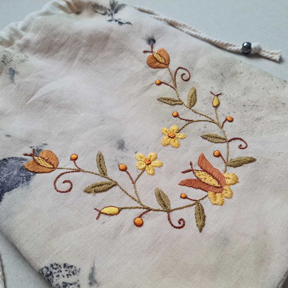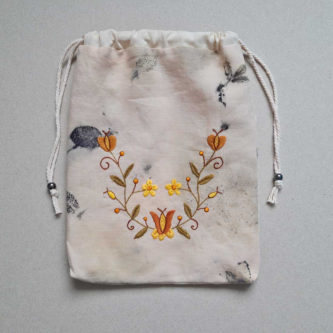 Wyszywany ręcznie woreczek, który został uszyty ze starej, lnianej koszulki, farbowanej w technice ecoprintingu.