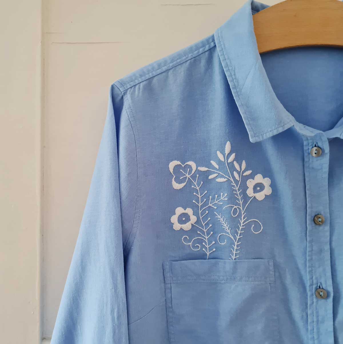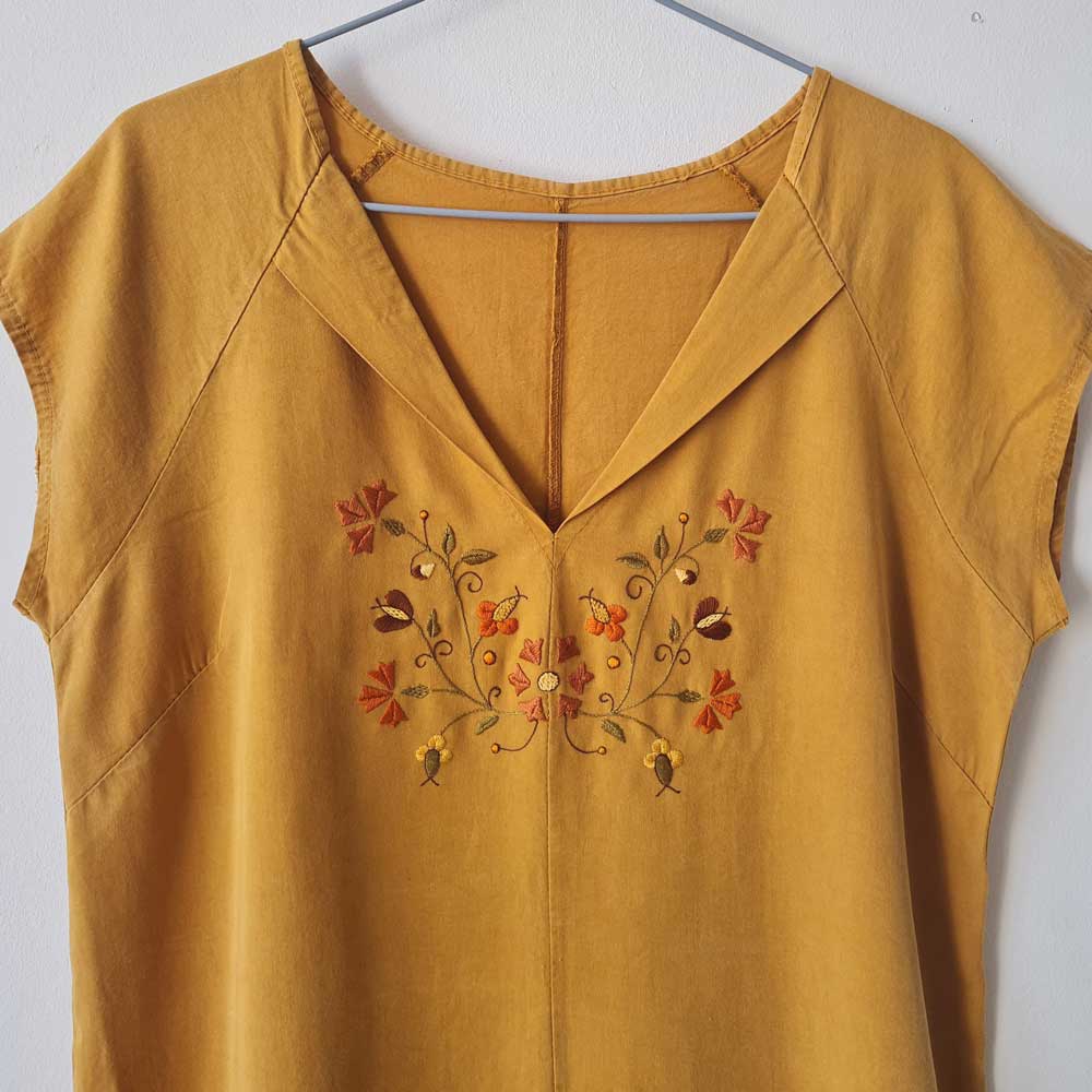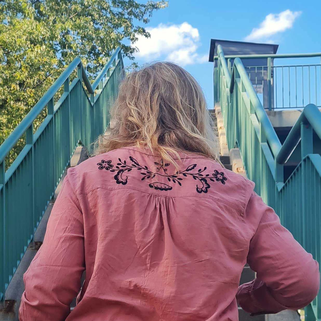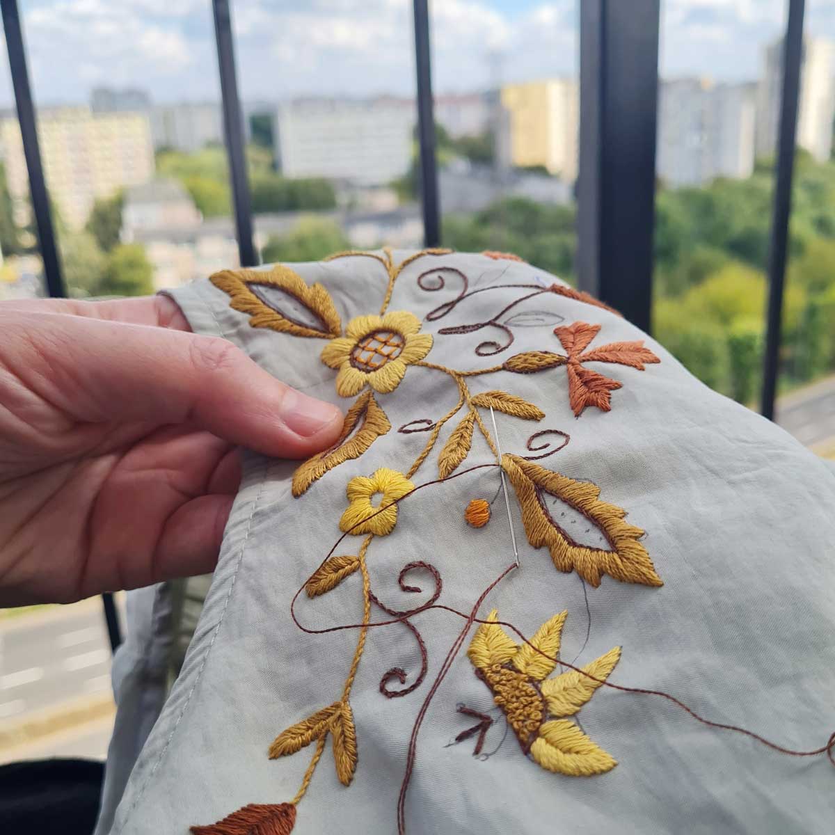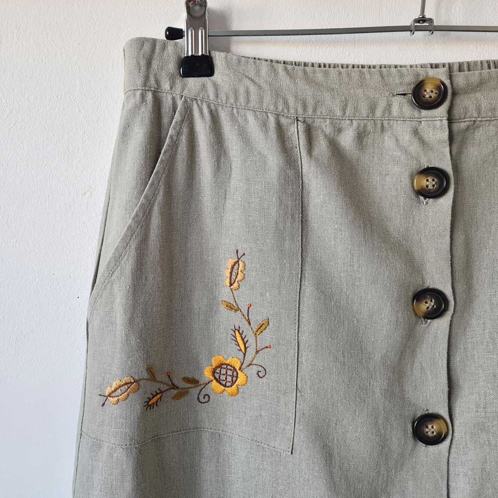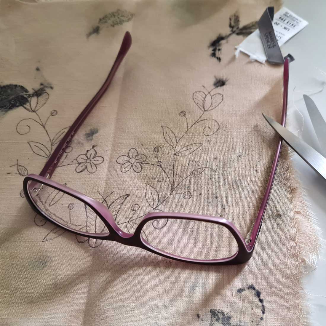 Wyszywany ręcznie woreczek, który został uszyty ze starej, lnianej koszulki, farbowanej w technice ecoprintingu.
