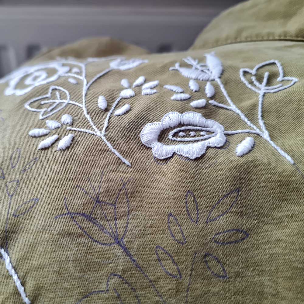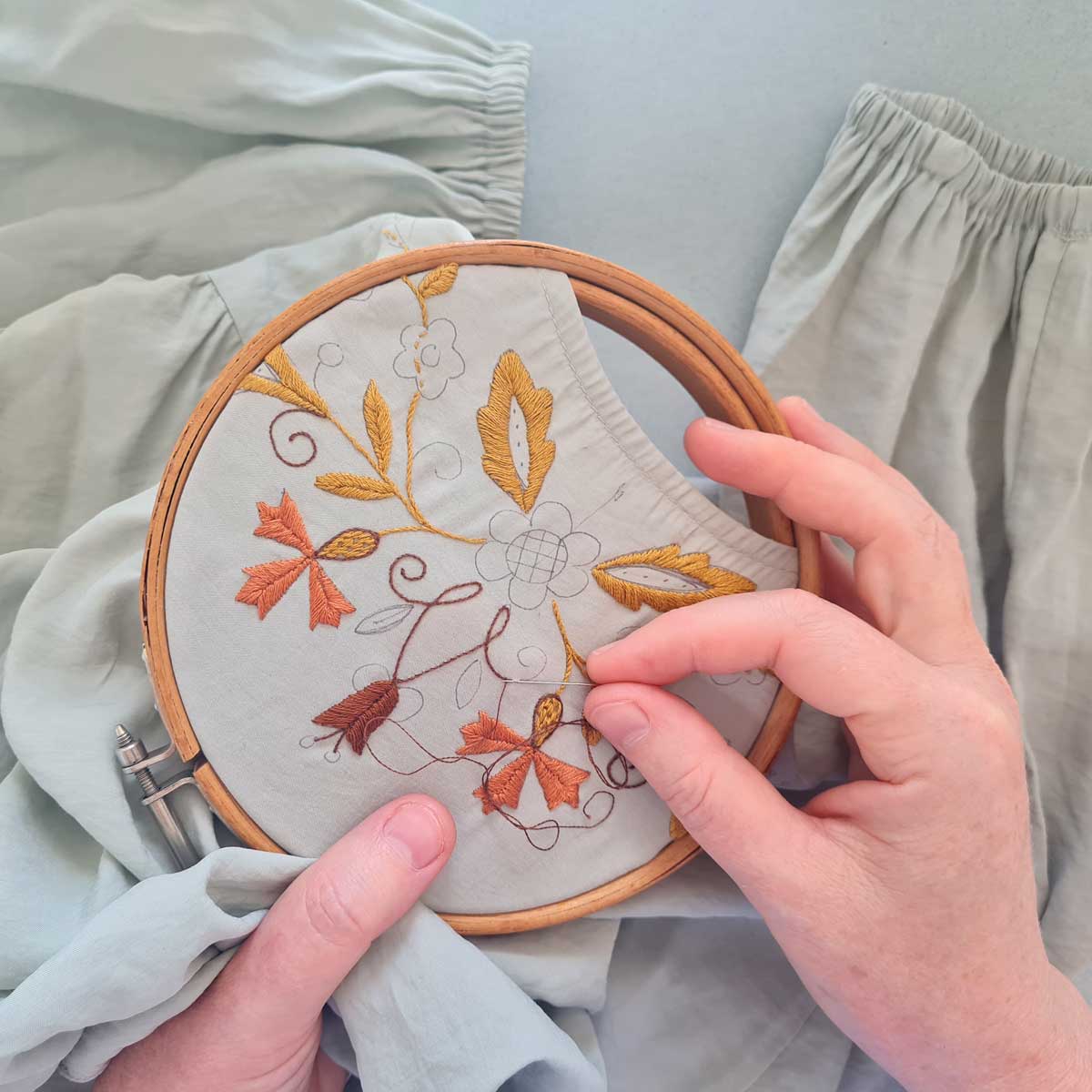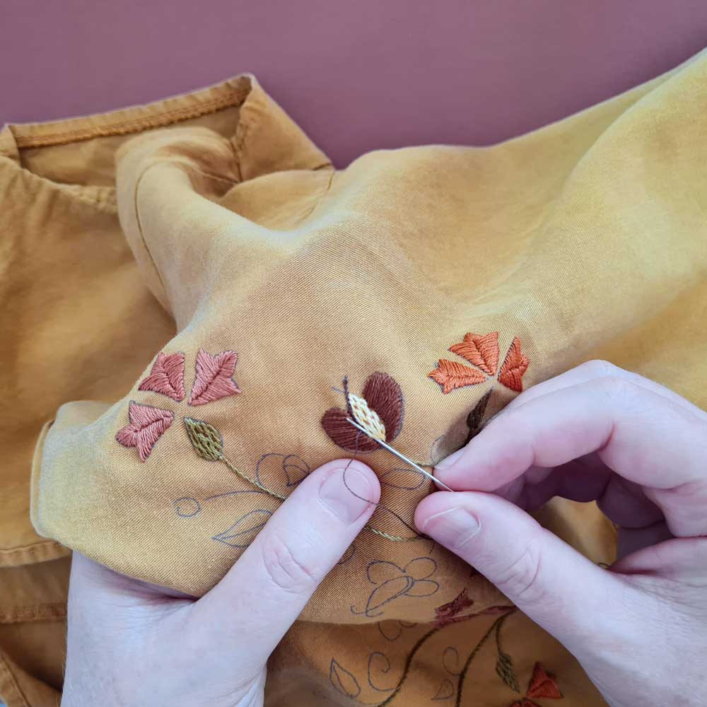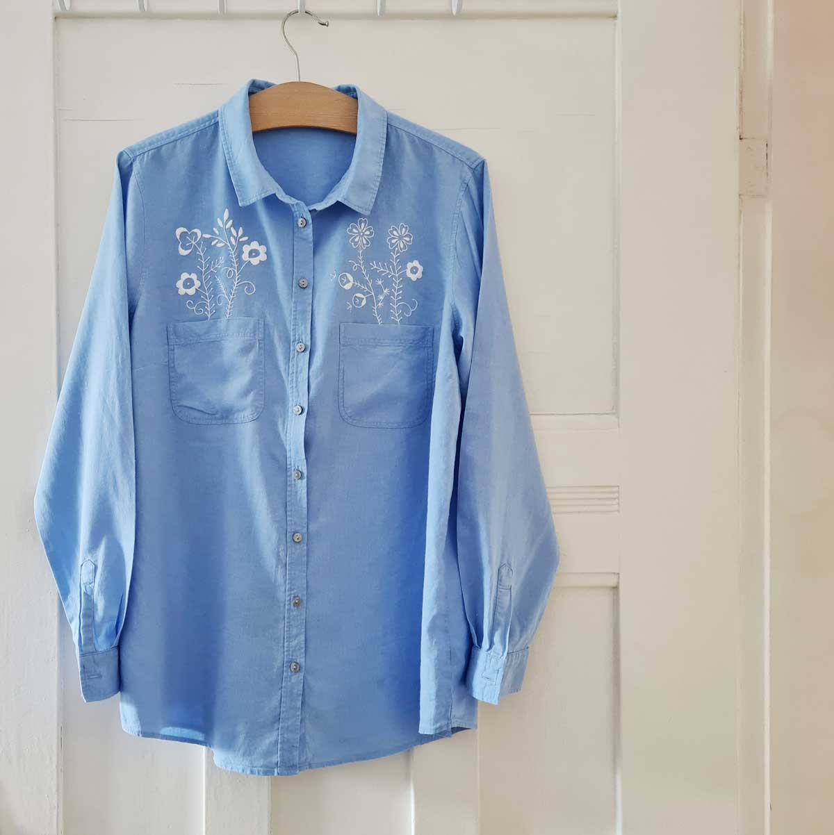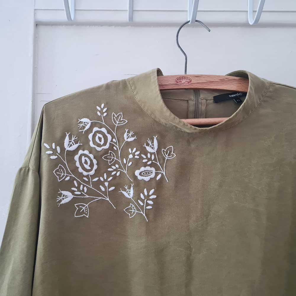 Wyszywany ręcznie woreczek, który został uszyty ze starej, lnianej koszulki, farbowanej w technice ecoprintingu.