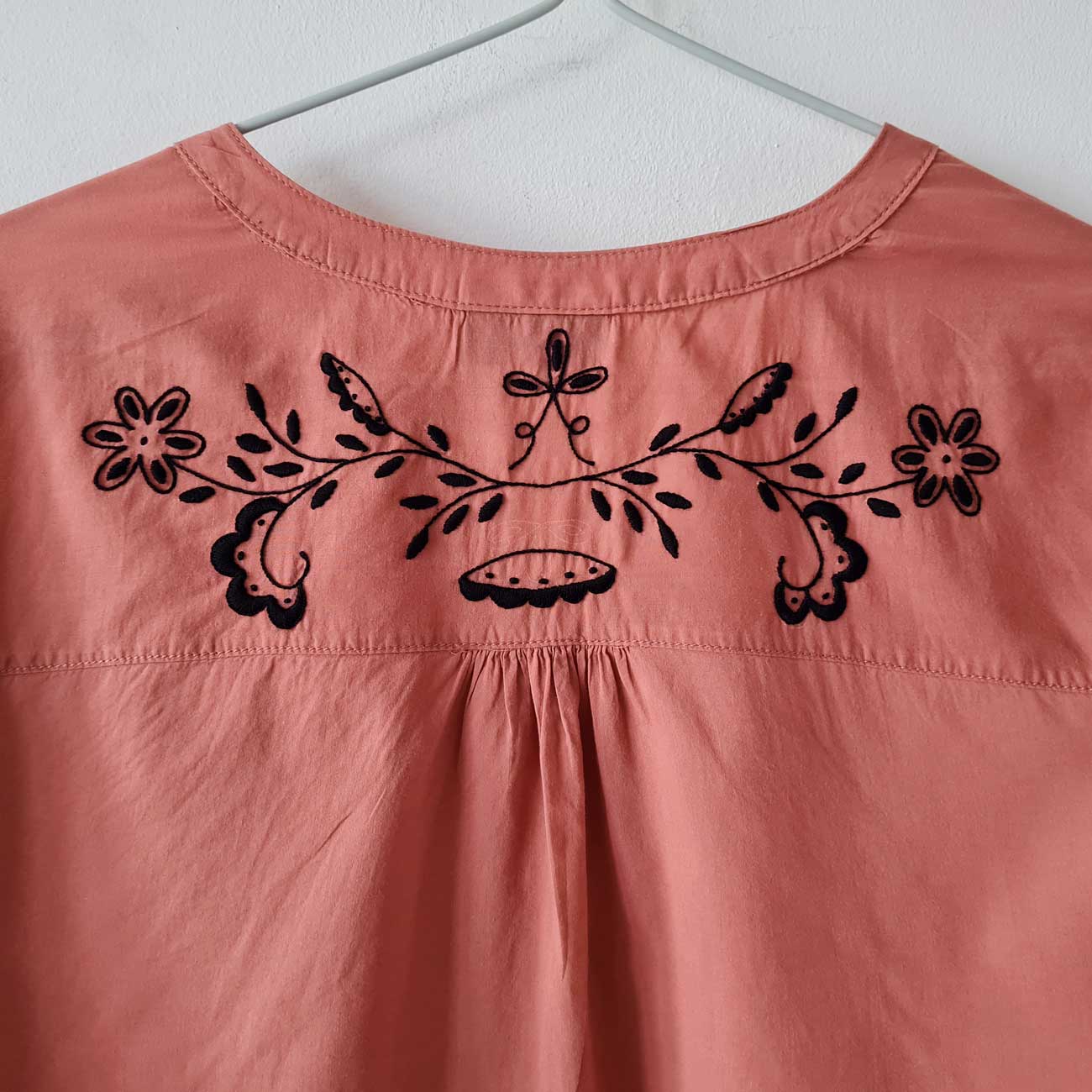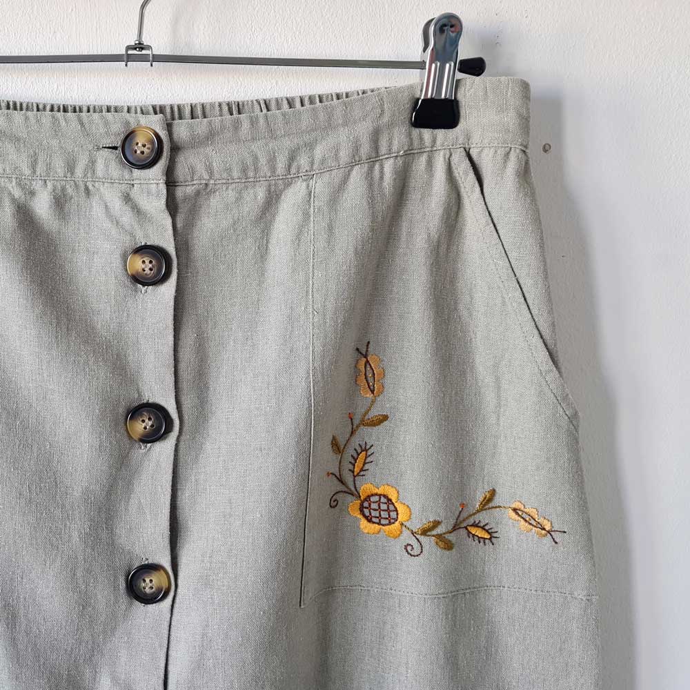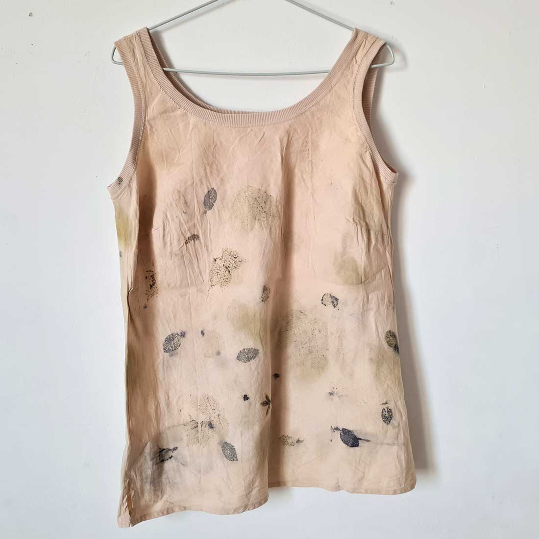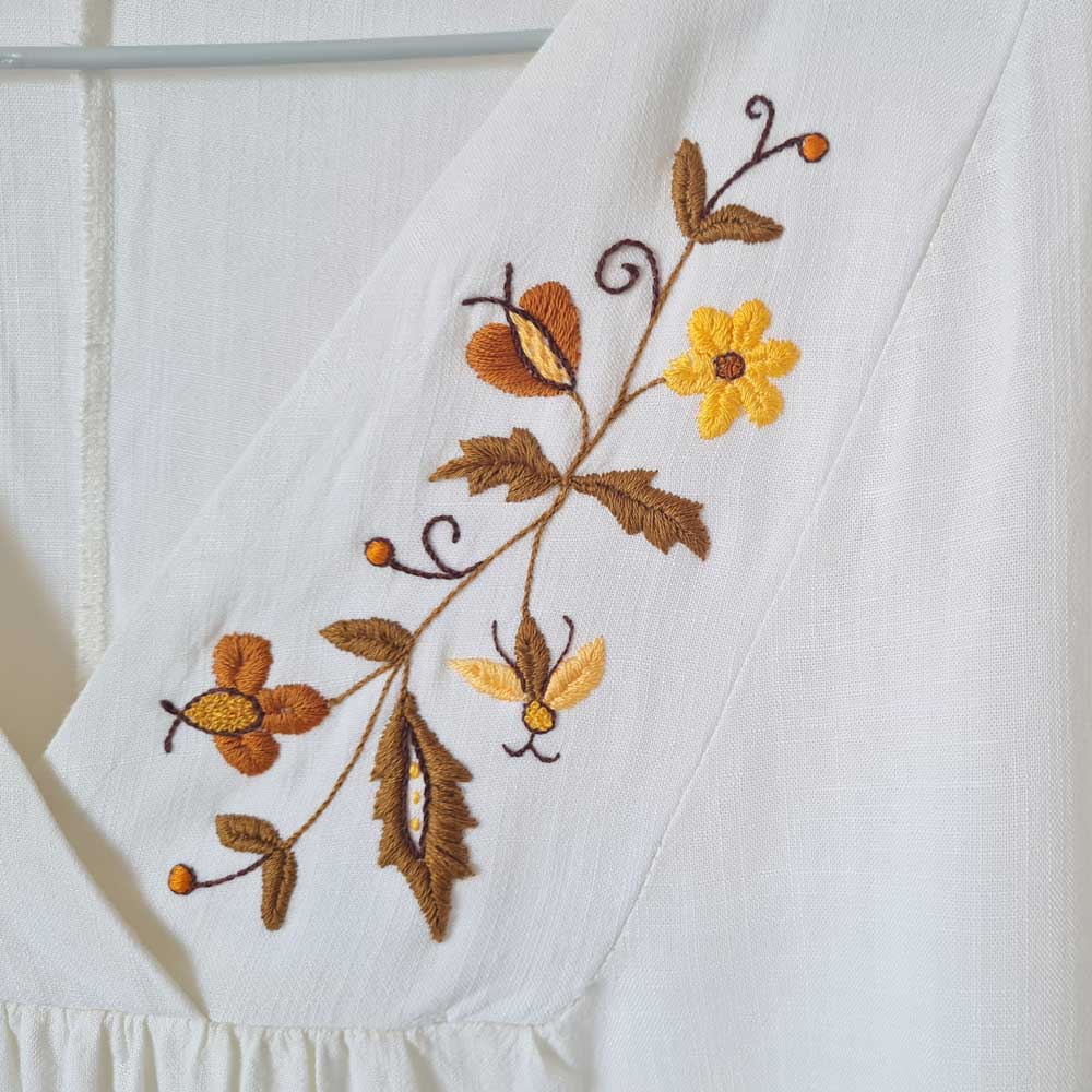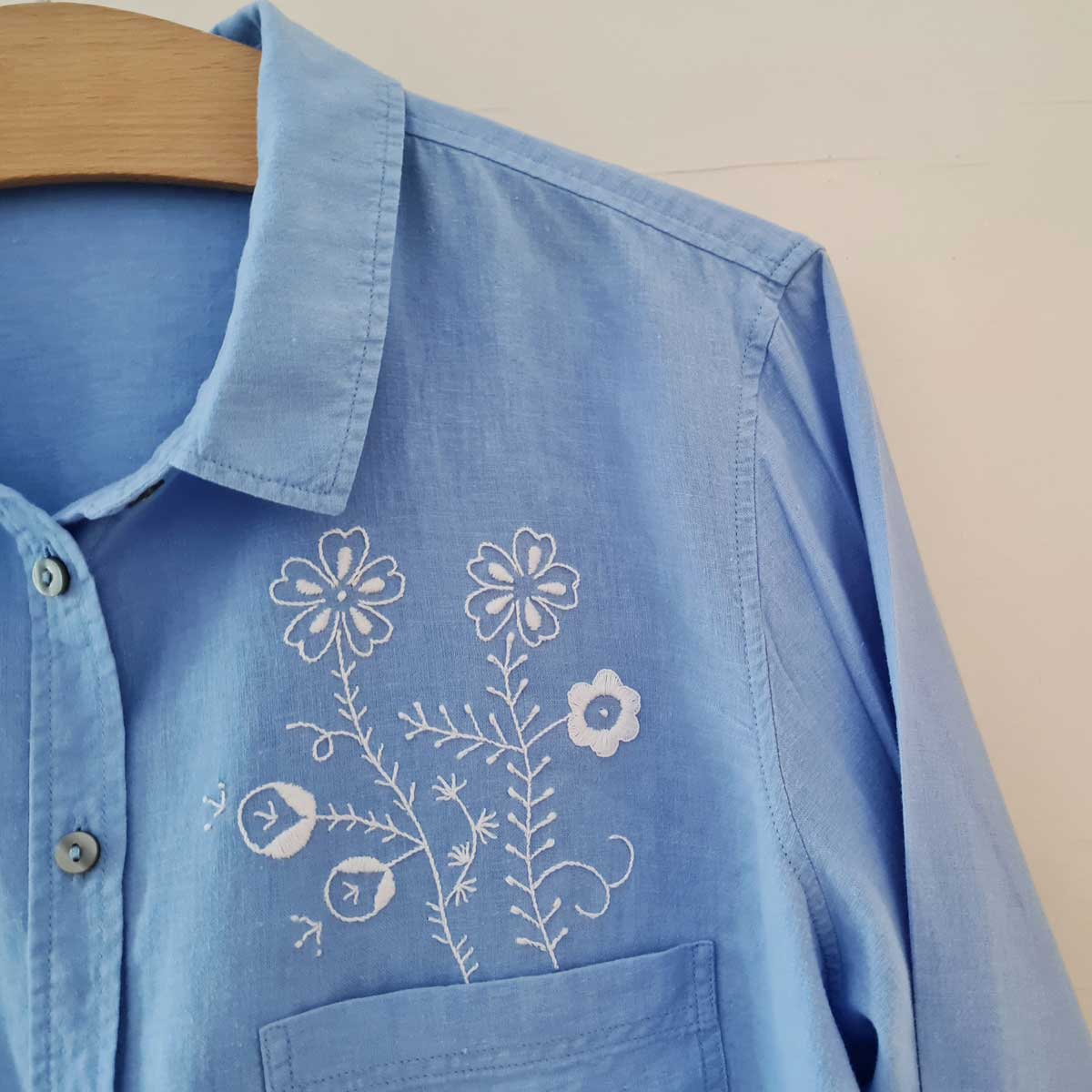 Wyszywany ręcznie woreczek, który został uszyty ze starej, lnianej koszulki, farbowanej w technice ecoprintingu.