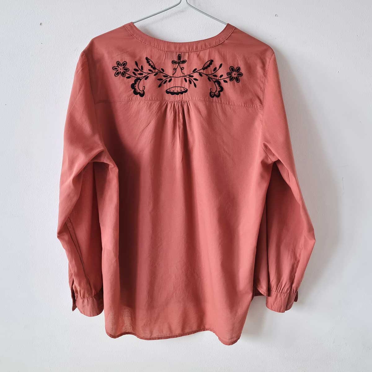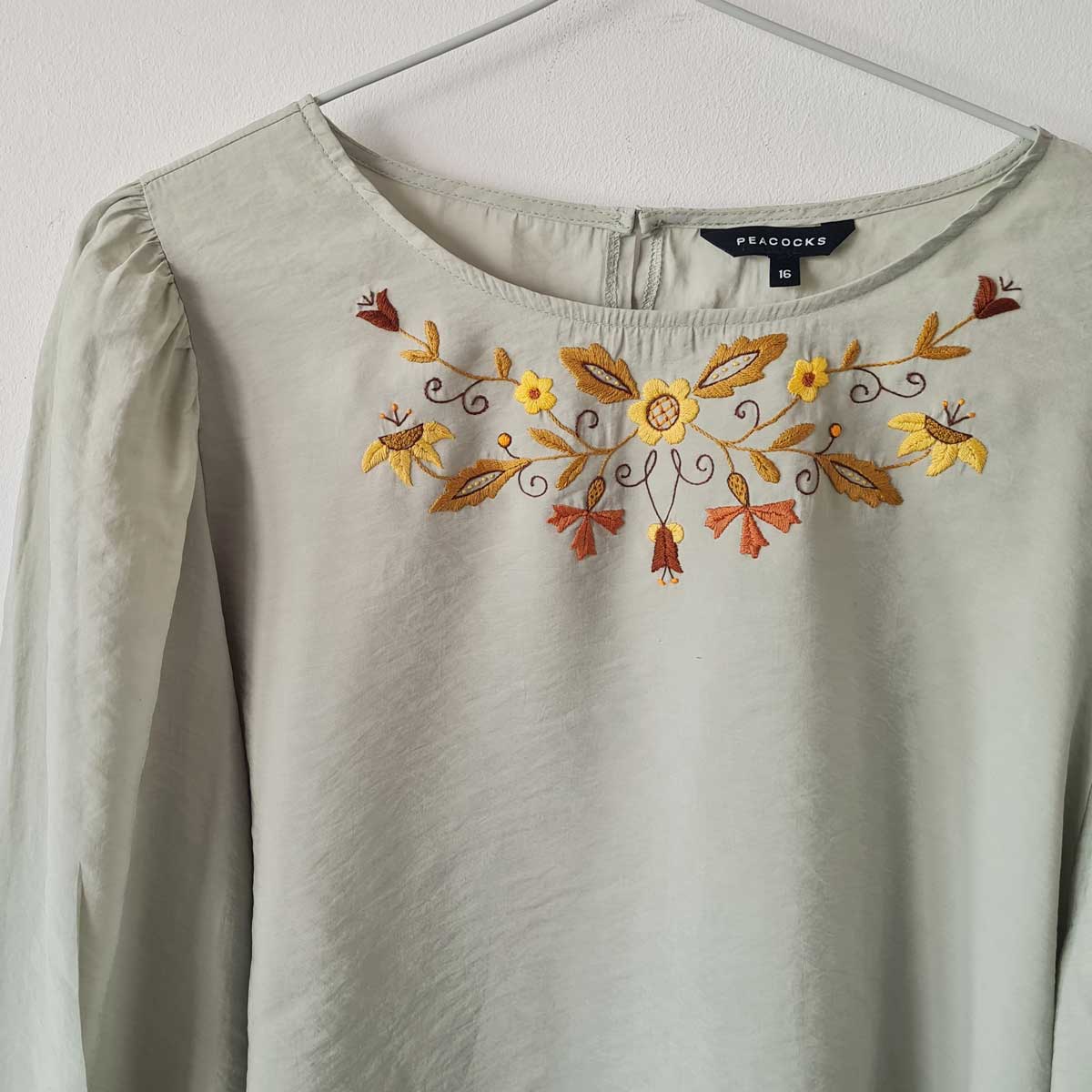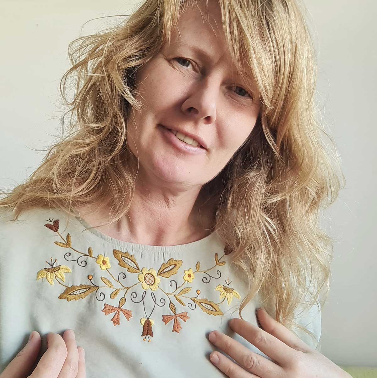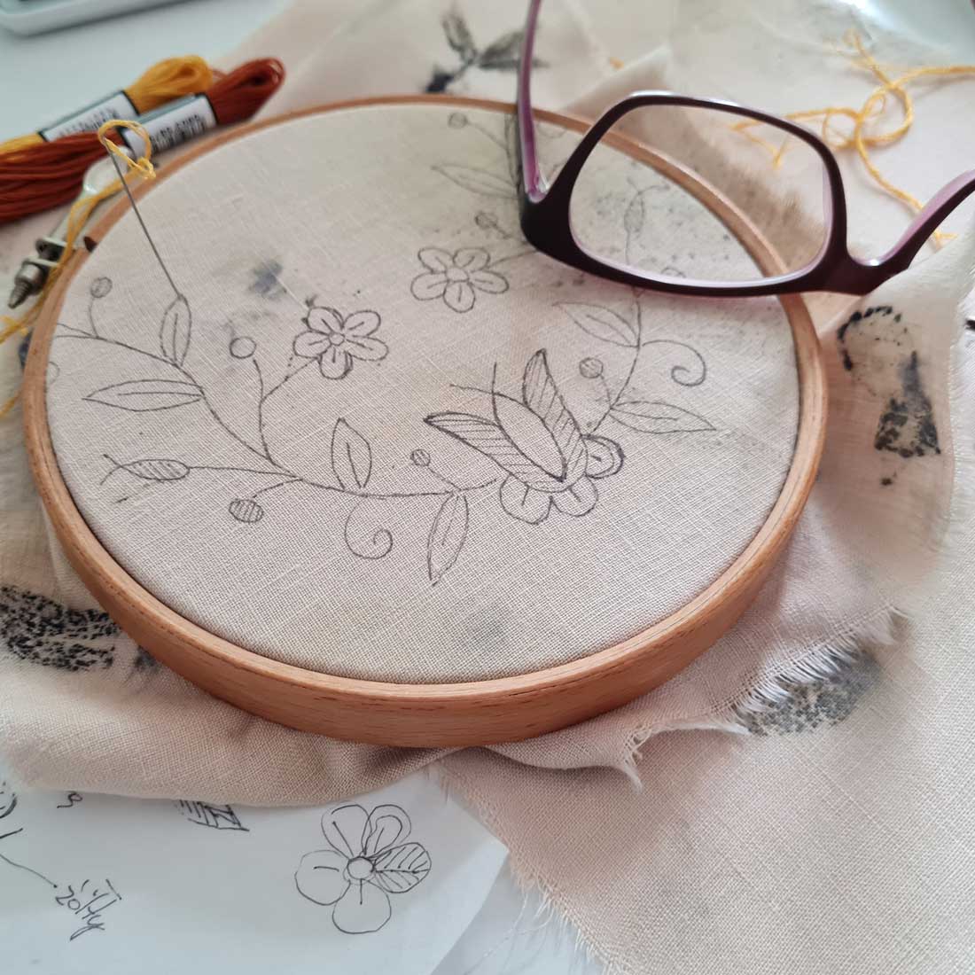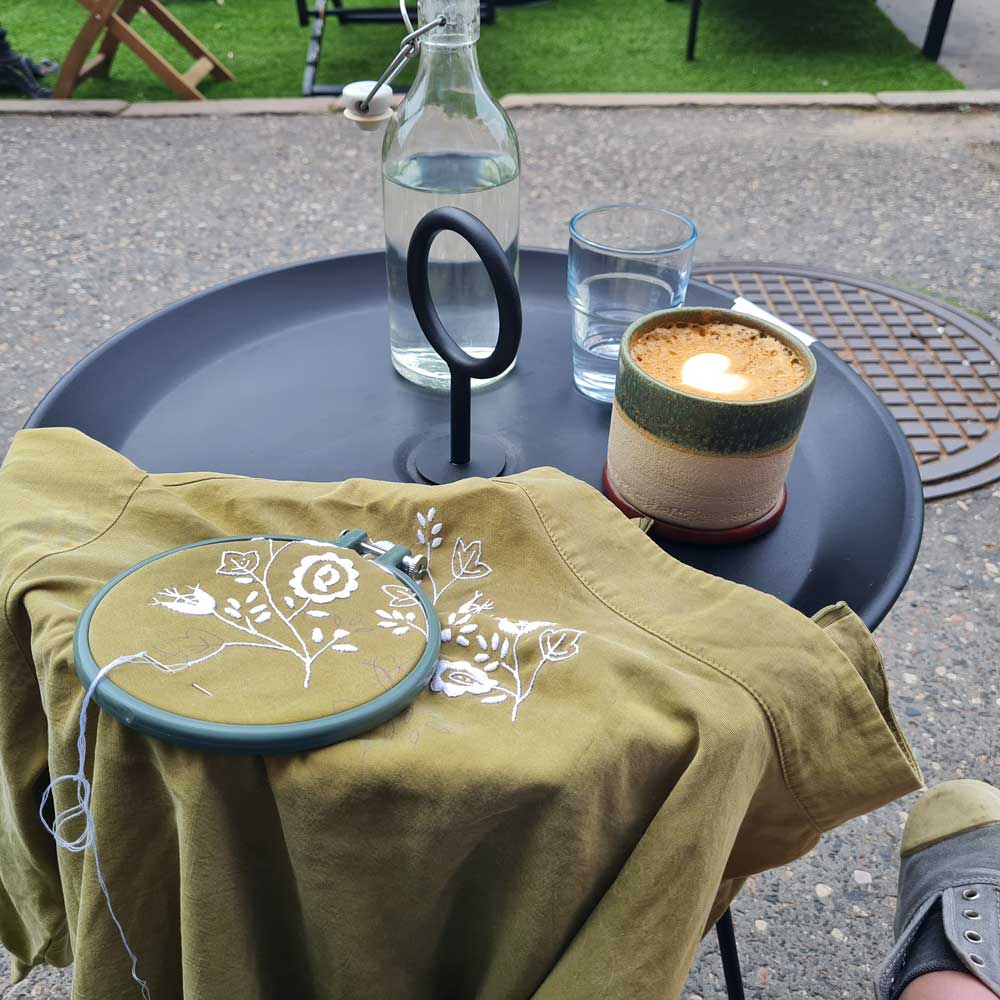Wyszywany ręcznie woreczek, który został uszyty ze starej, lnianej koszulki, farbowanej w technice ecoprintingu.