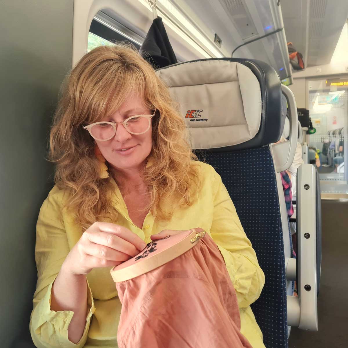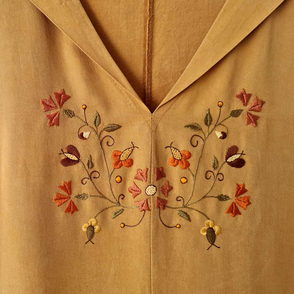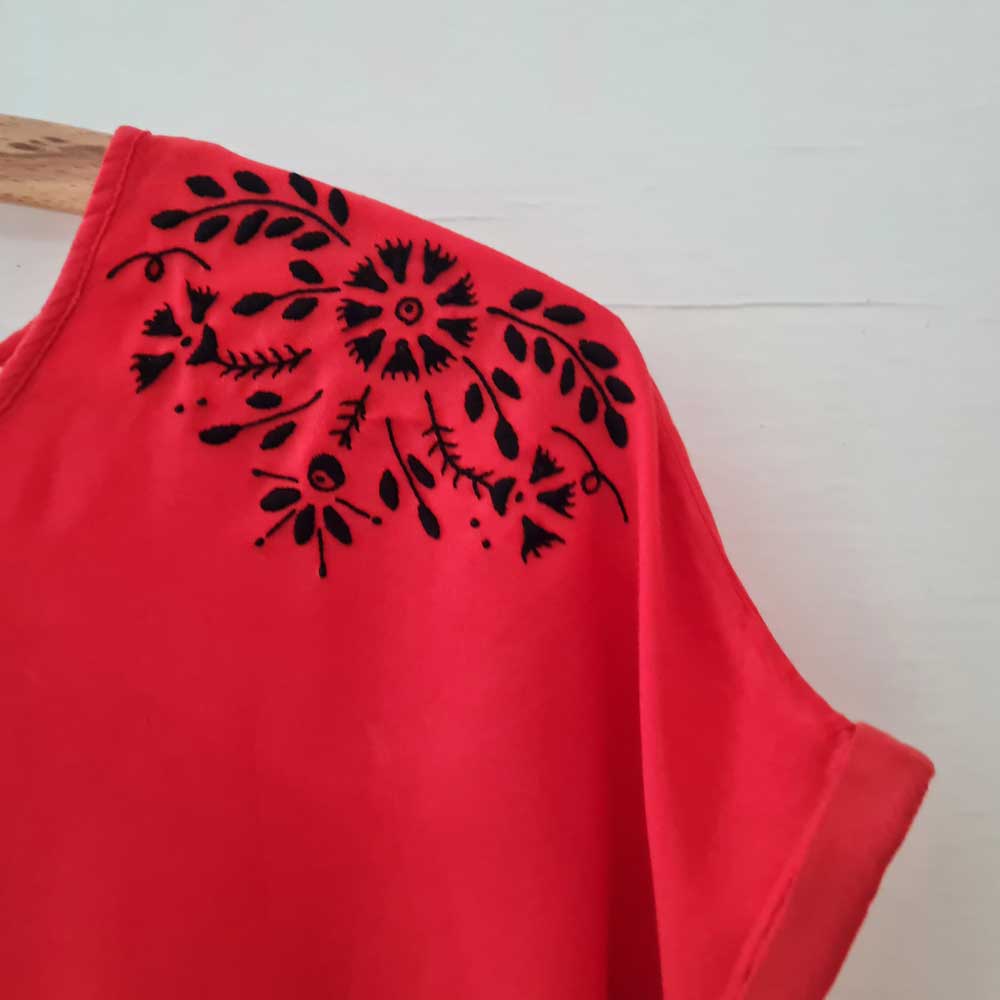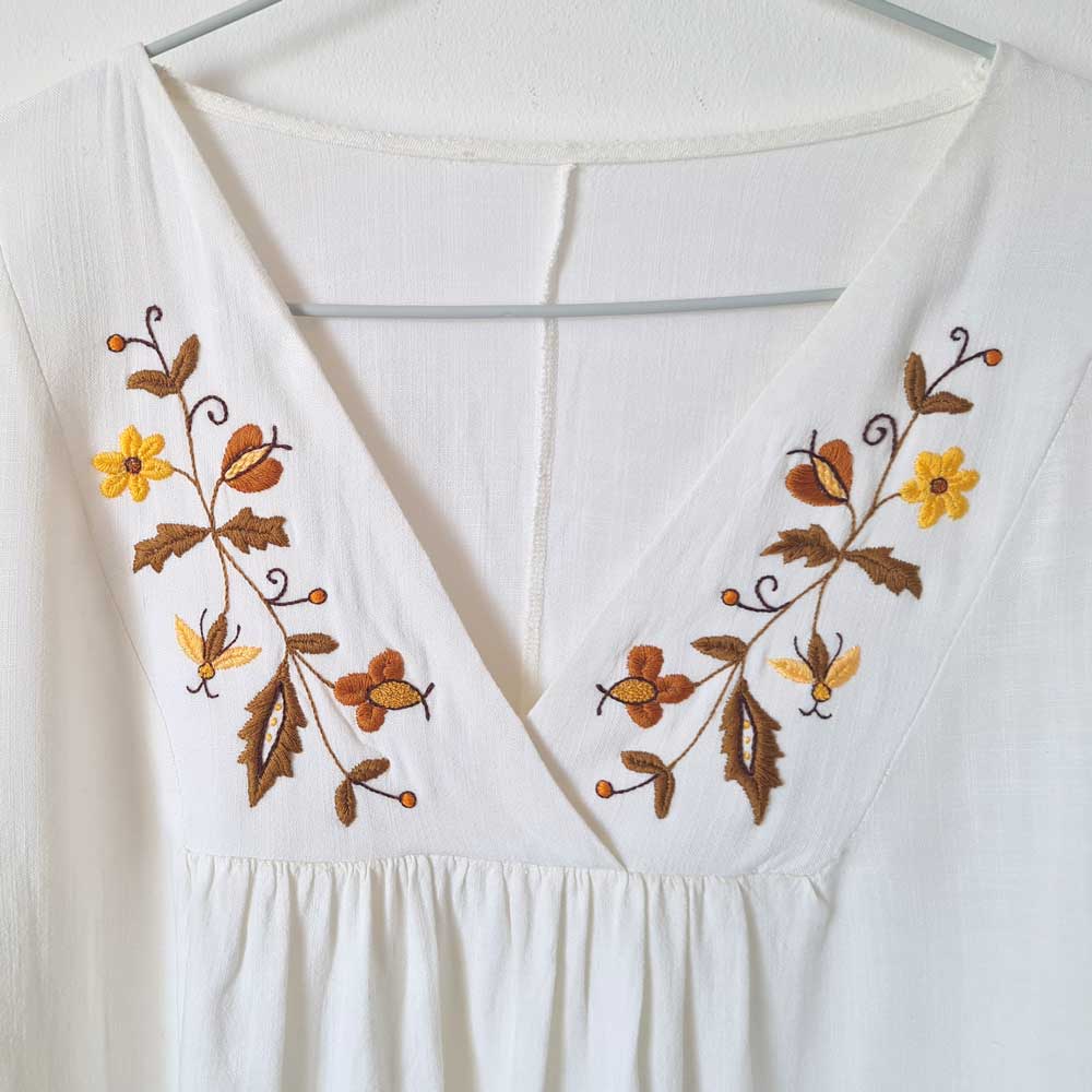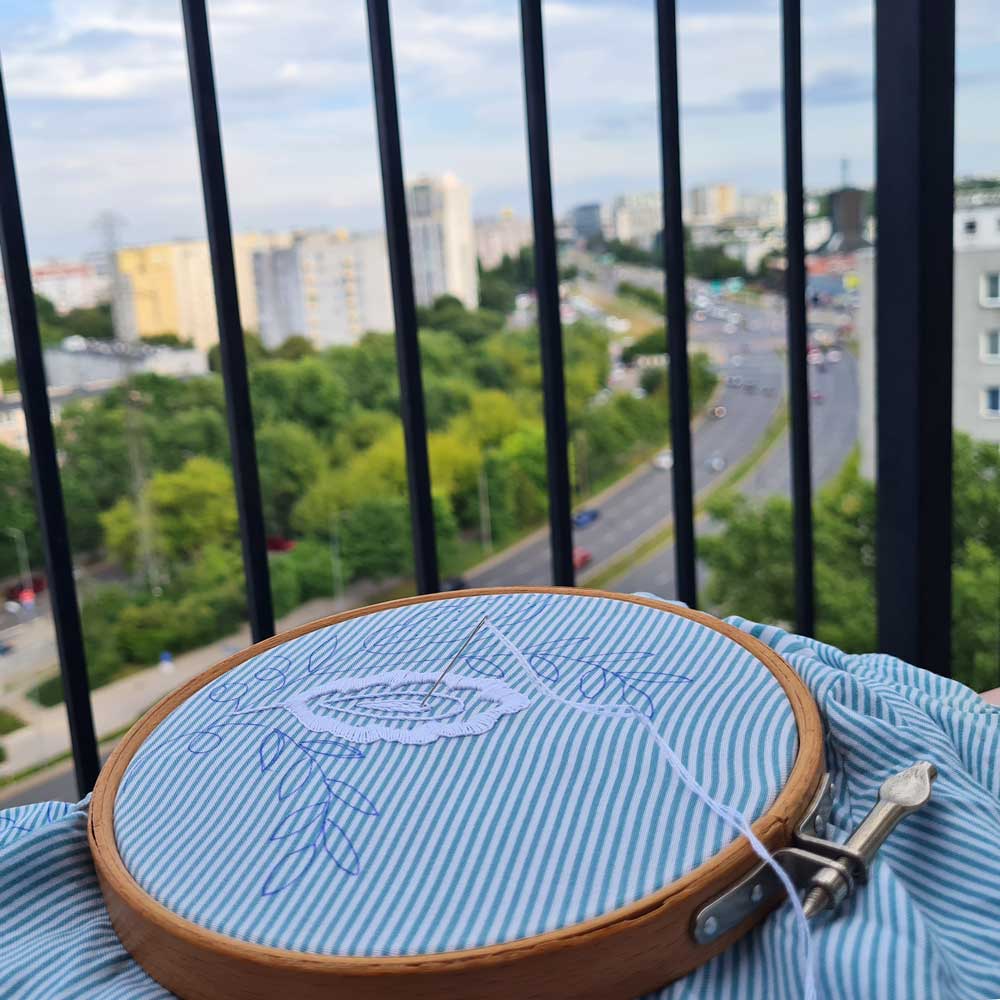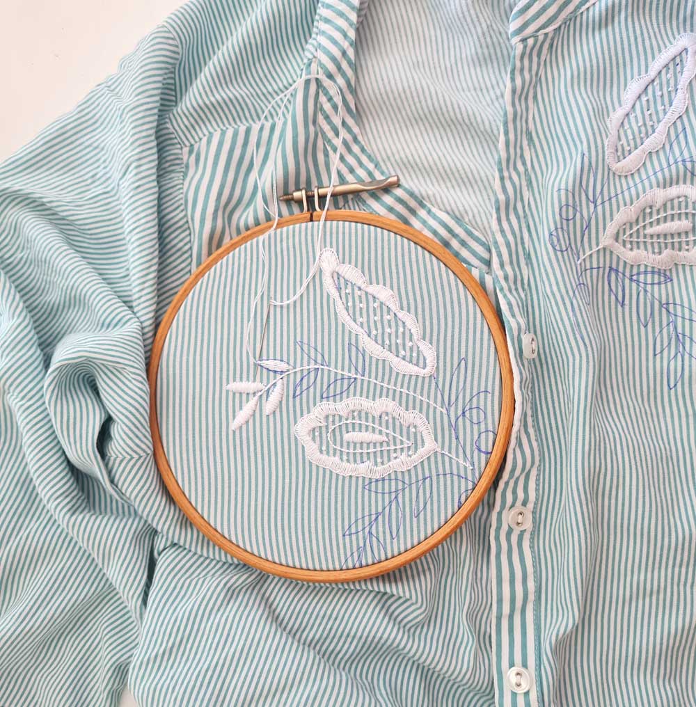 Wyszywany ręcznie woreczek, który został uszyty ze starej, lnianej koszulki, farbowanej w technice ecoprintingu.