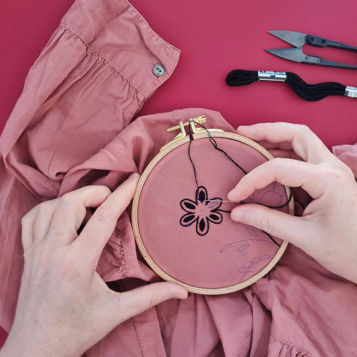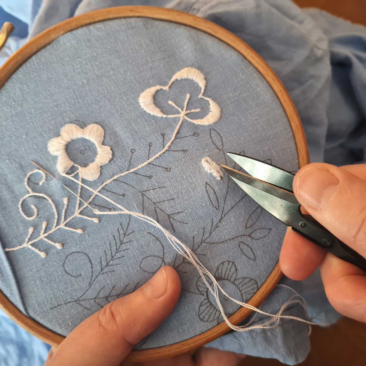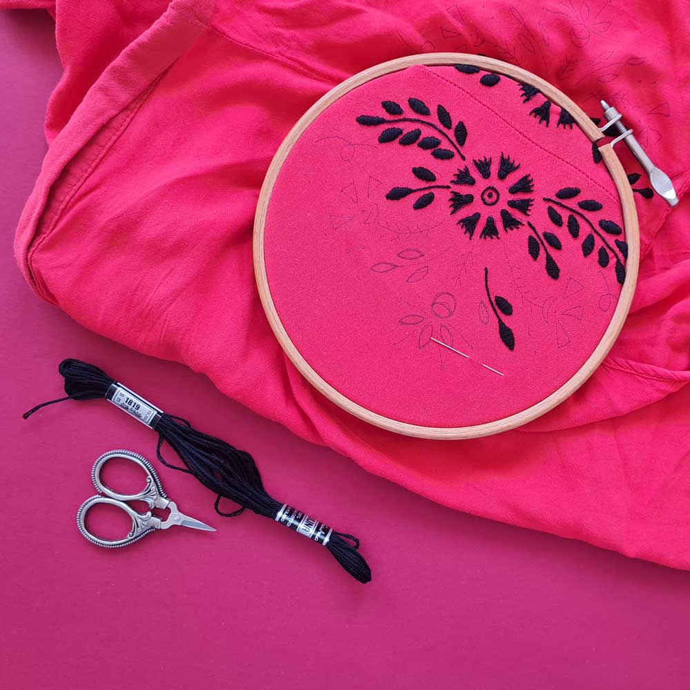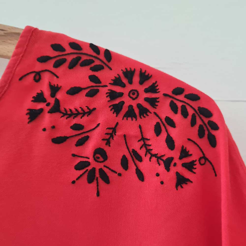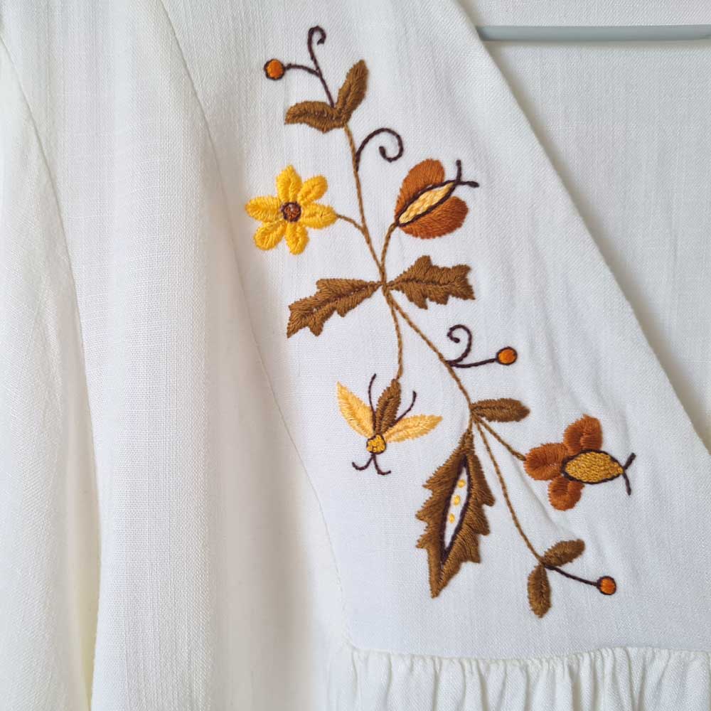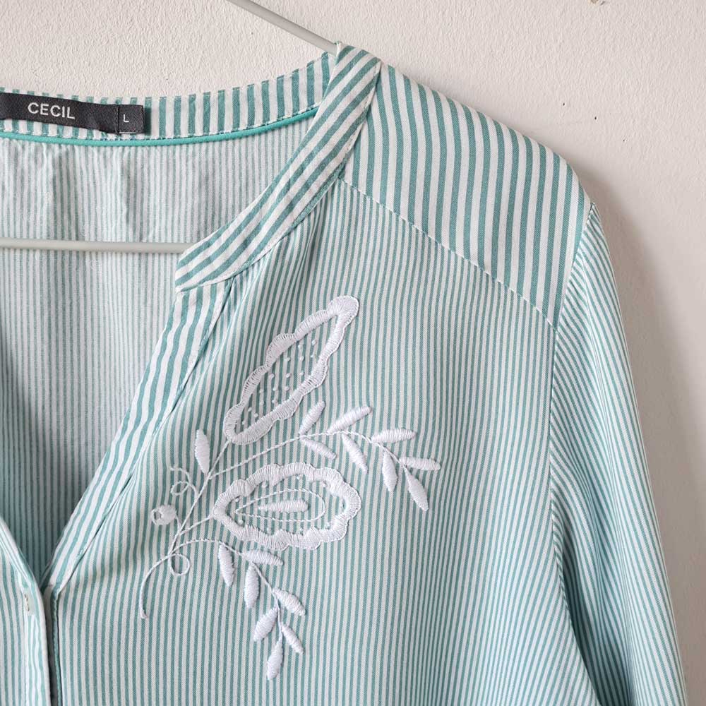 Wyszywany ręcznie woreczek, który został uszyty ze starej, lnianej koszulki, farbowanej w technice ecoprintingu.