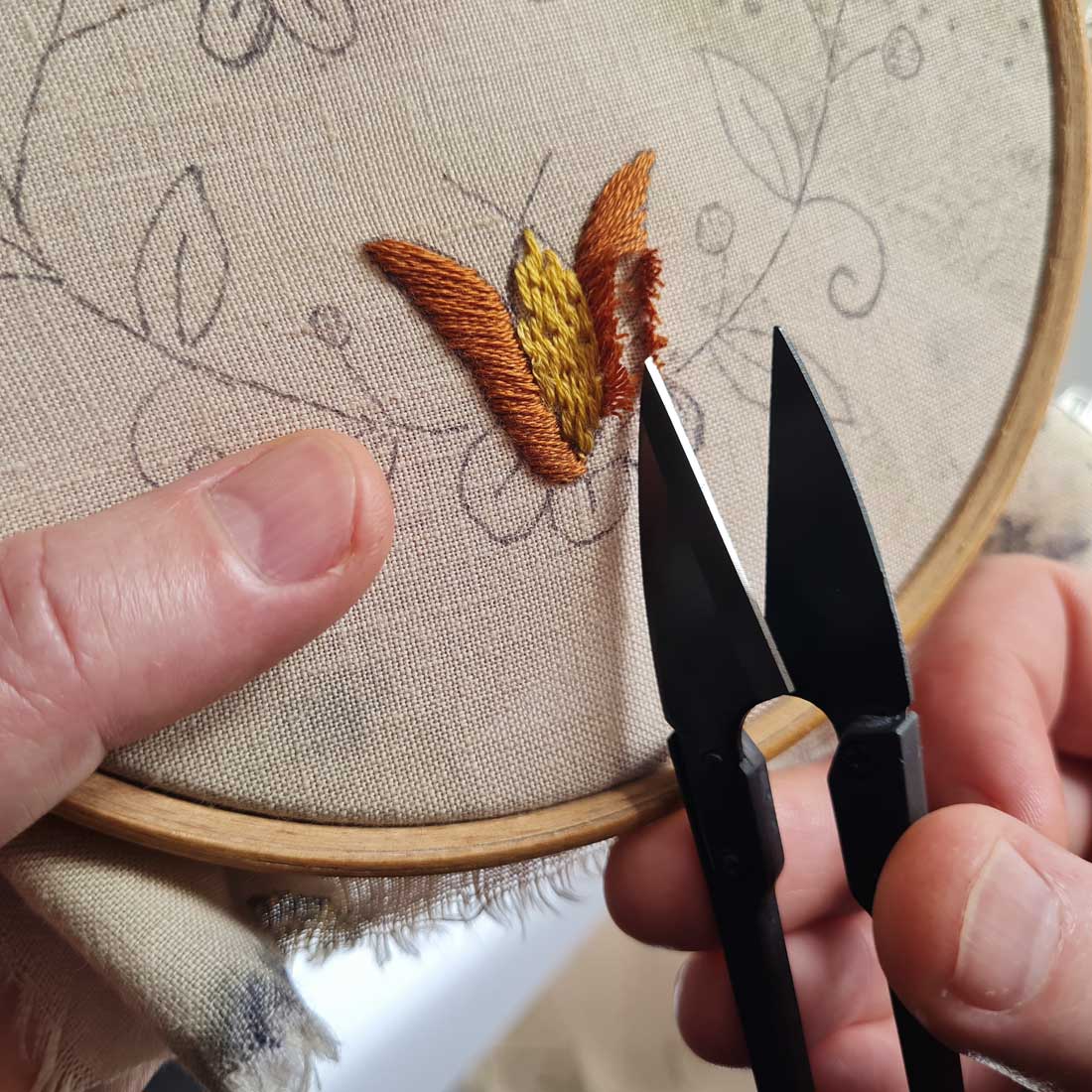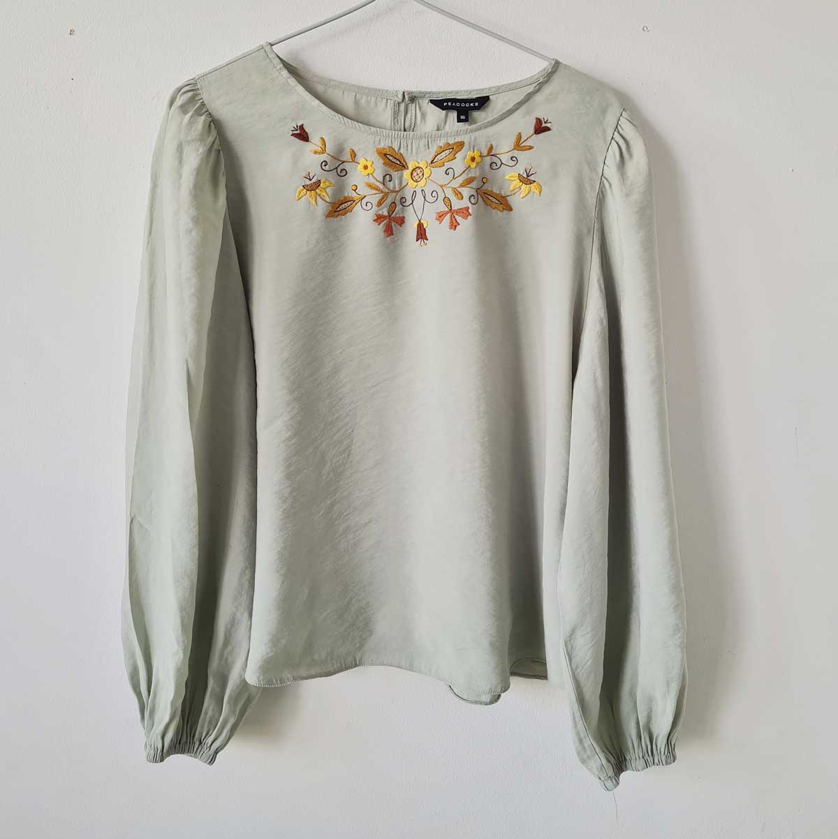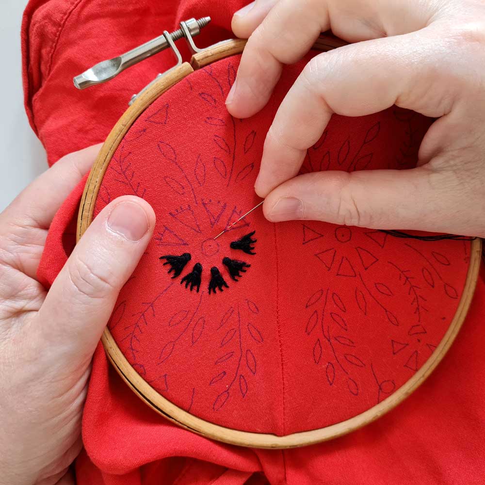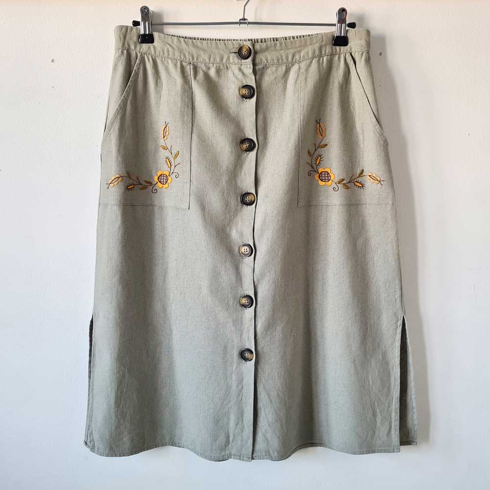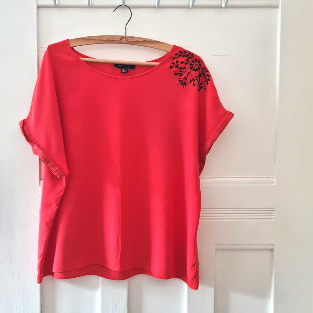 Wyszywany ręcznie woreczek, który został uszyty ze starej, lnianej koszulki, farbowanej w technice ecoprintingu.