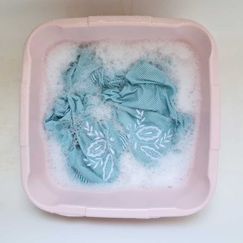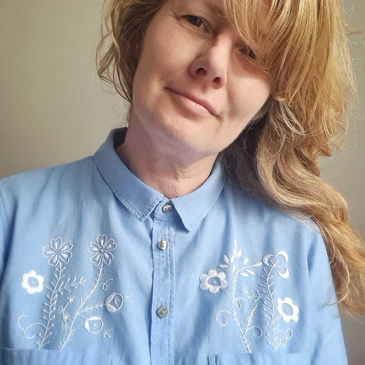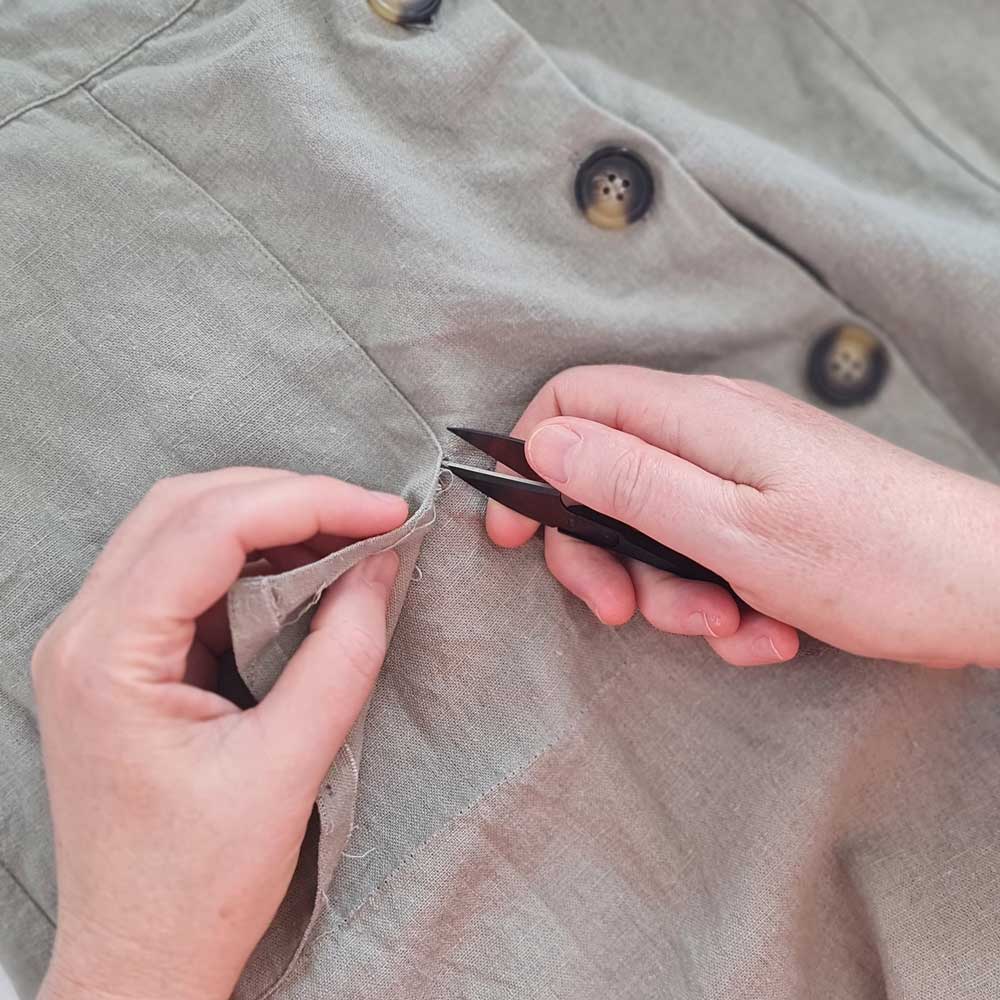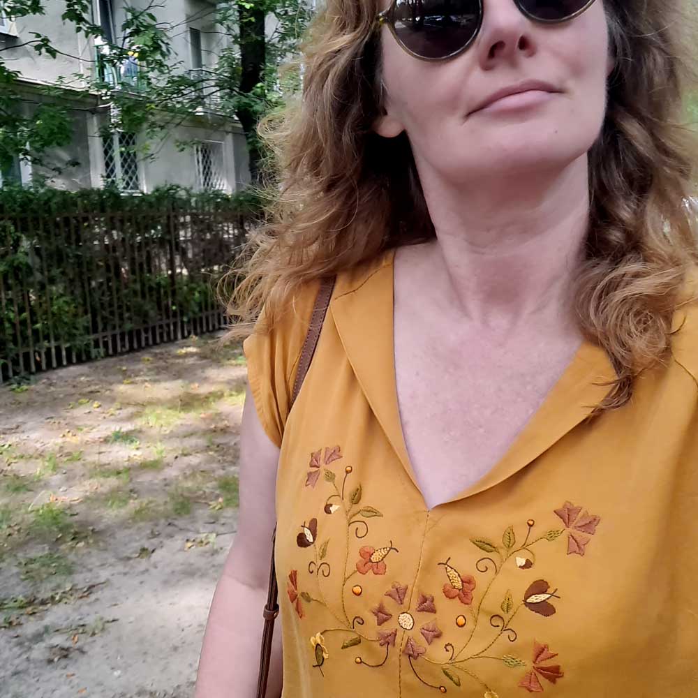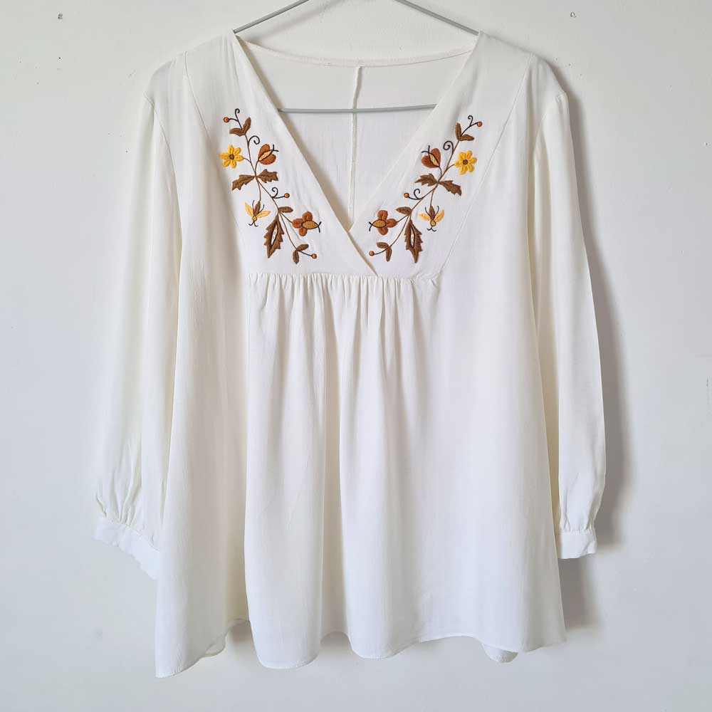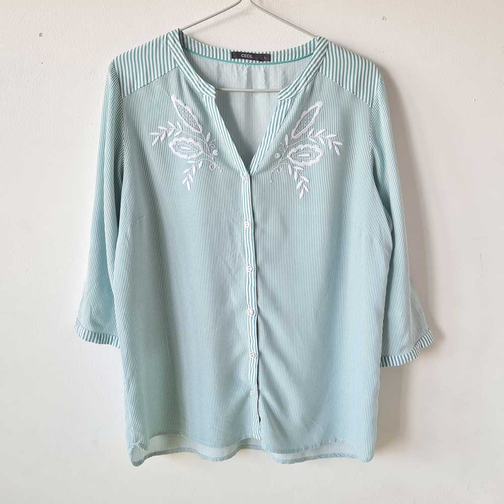 Wyszywany ręcznie woreczek, który został uszyty ze starej, lnianej koszulki, farbowanej w technice ecoprintingu.