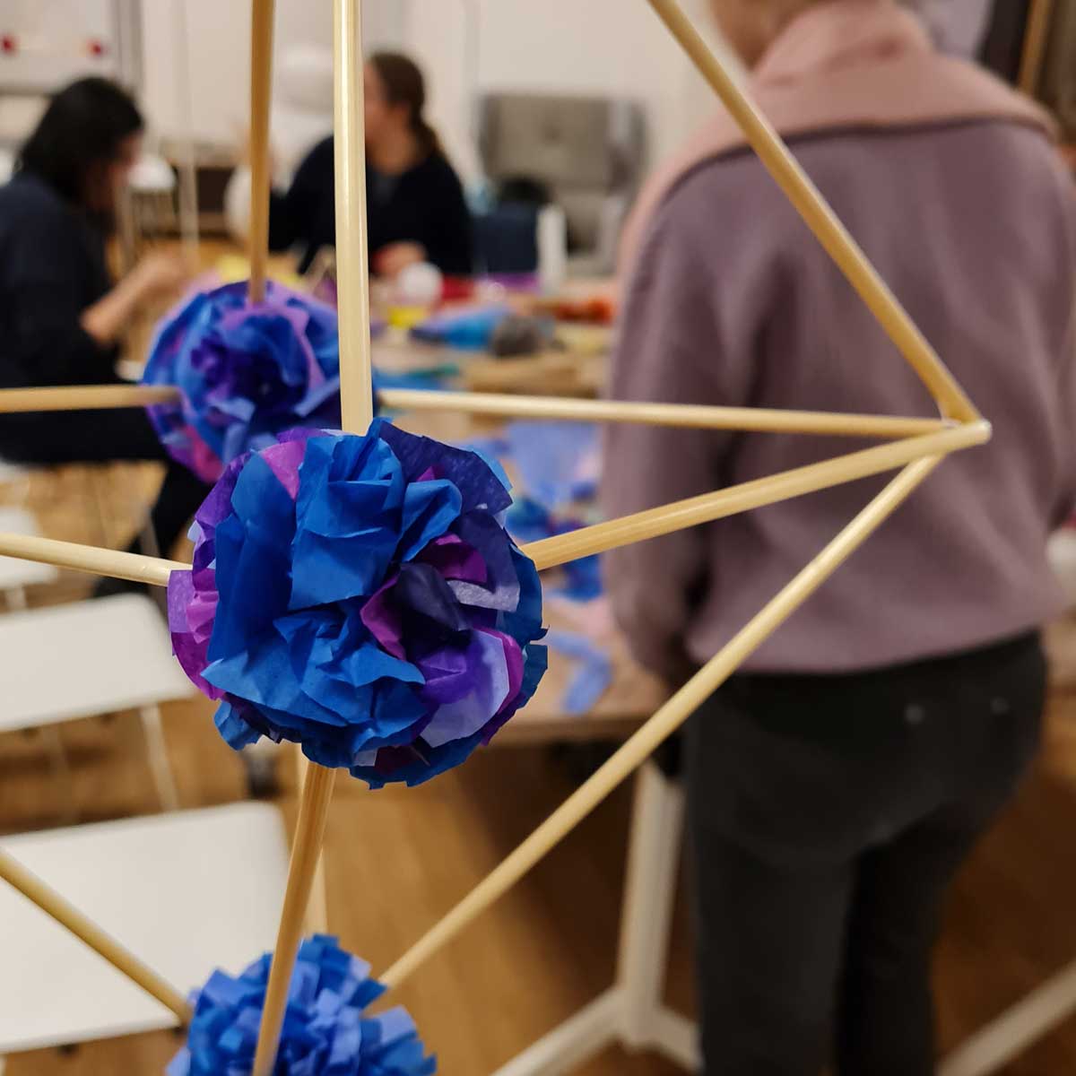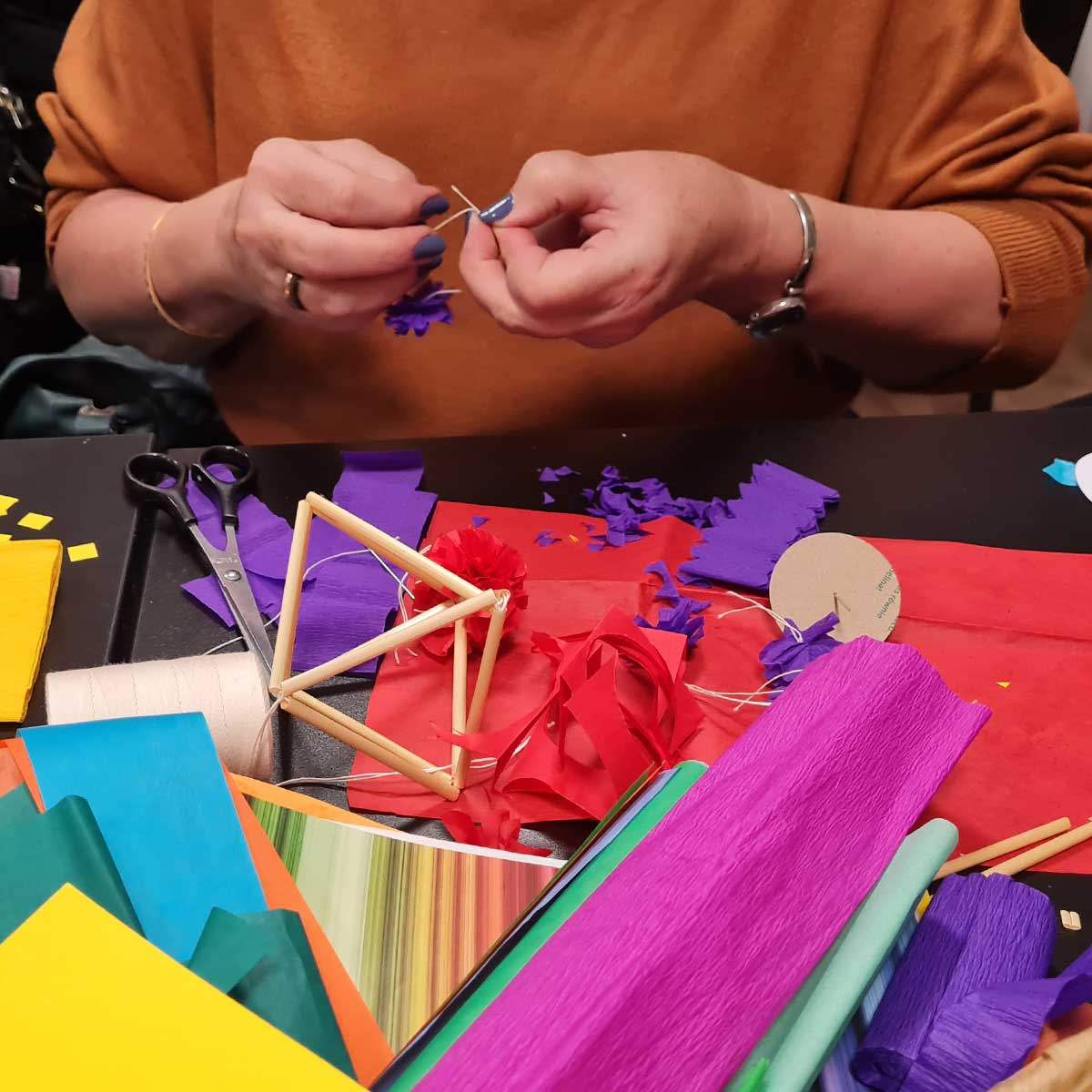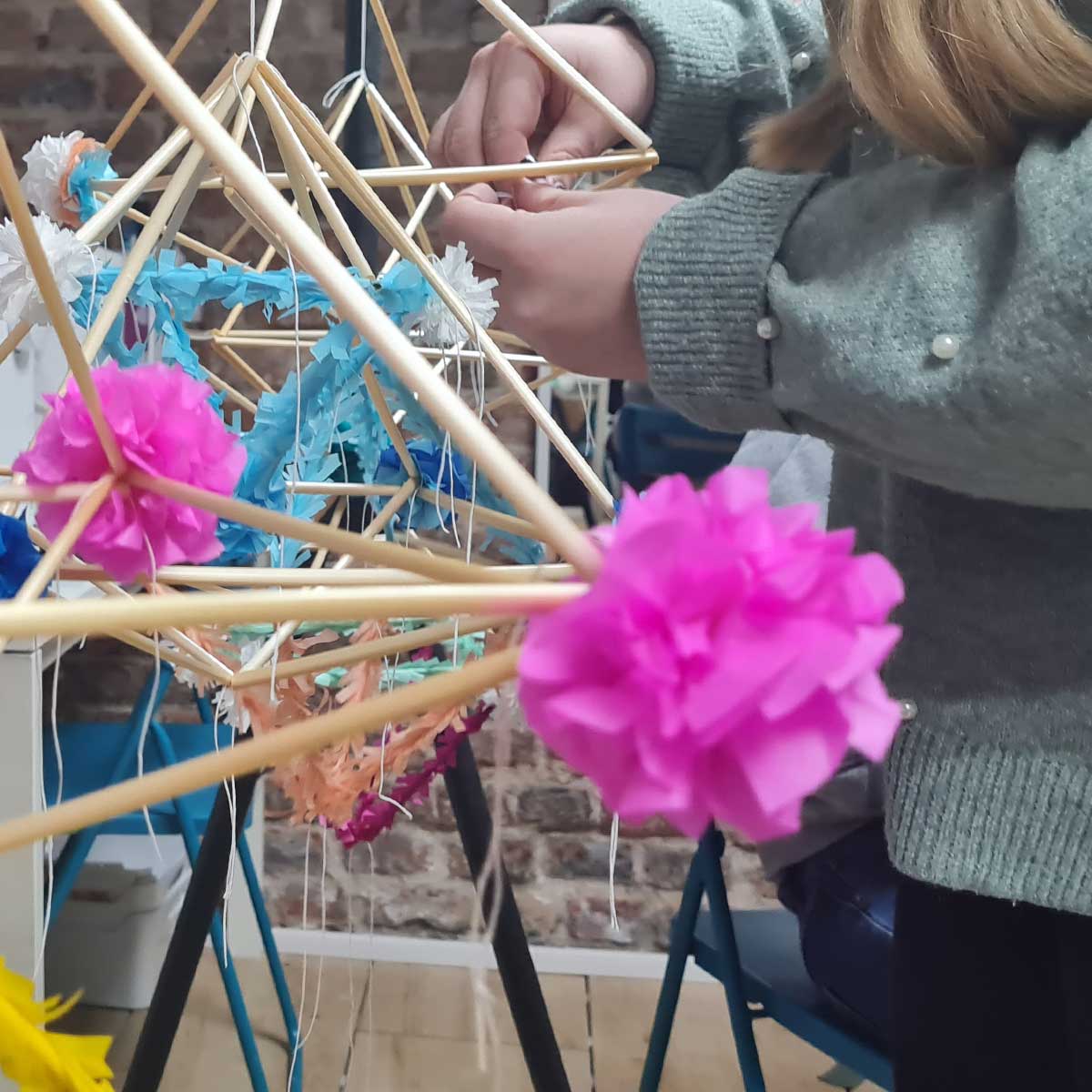 W czasie warsztatów wykonywania pająków ludowych uczestniczki i uczestnicy wykonają prostą formę pająka kryształowego, który każdy ozdobi wg. uznania - w swojej ulubionej kolorystyce - kolorowymi kwiatami [kalinka, stokrotka, chryzantem]. Zdobyta wiedza i doświadczenie pozwolą na realizację większych form pająków ludowych wymagających więcej czasu.