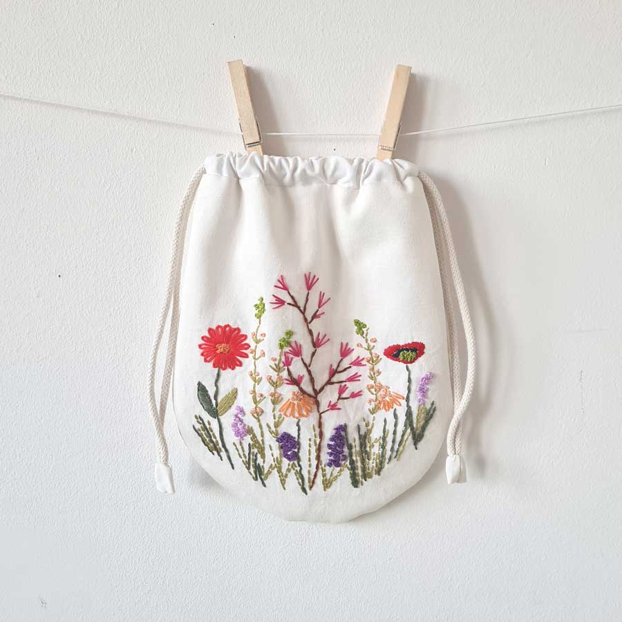 Woreczki z haftem regionalnym. Prezentowane woreczki ukazują piękno haftów ludowych z Kujaw, Puław i Kurpi. Każdy wzór został osobiście zaprojektowany, nawiązując do tradycji danego regionu. Woreczki powstały z tkanin z odzysku – dawnych prześcieradeł, pościeli czy lnianych spodni – podkreślając ideę zrównoważonego rękodzieła i drugiego życia materiałów.